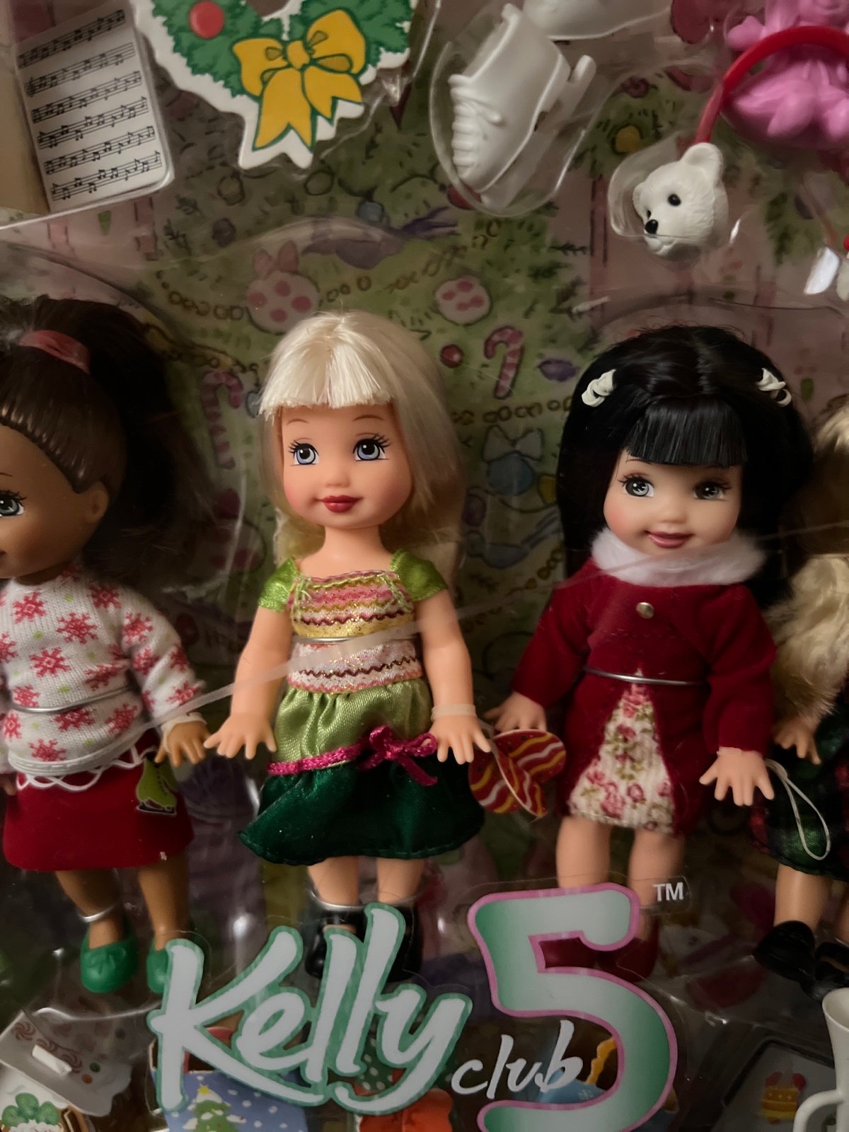 NRFB Rare Kelly Club Bunch Set. Very cute and unique. The box is in good condition. The adhesive tape attaching the plastic to the cardboard has come loose. A few items are loose in box. There is a scratch in plastic from middle of box to the right side. The items are mint. Review carefully. Comes from a clean, smoke free home.