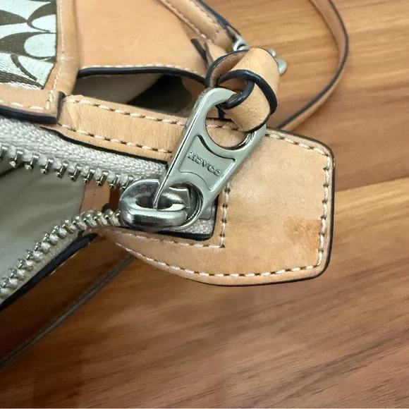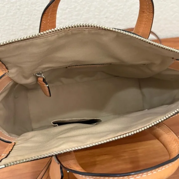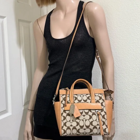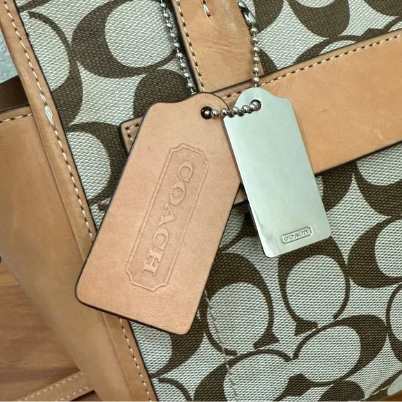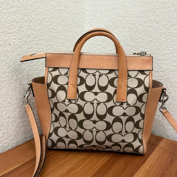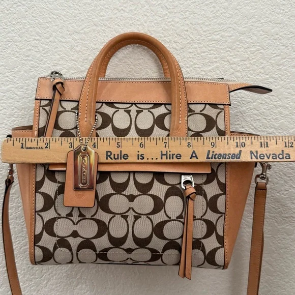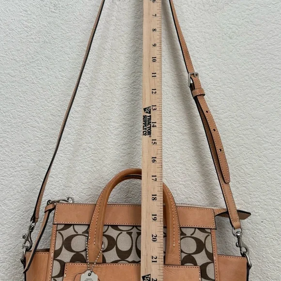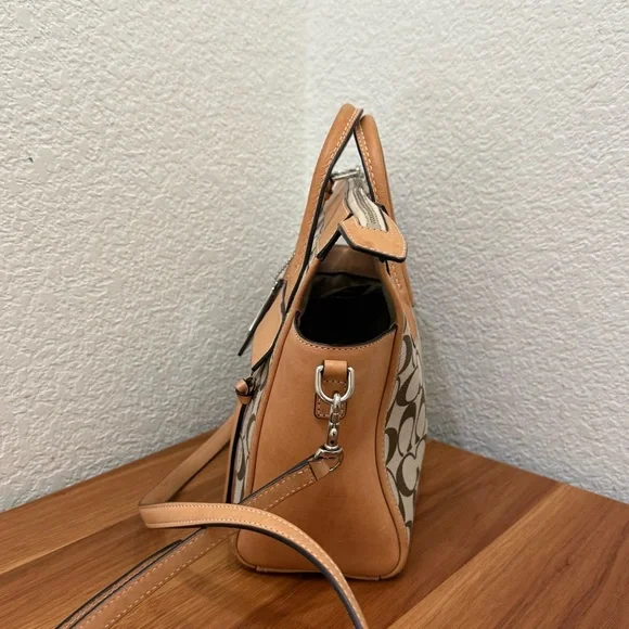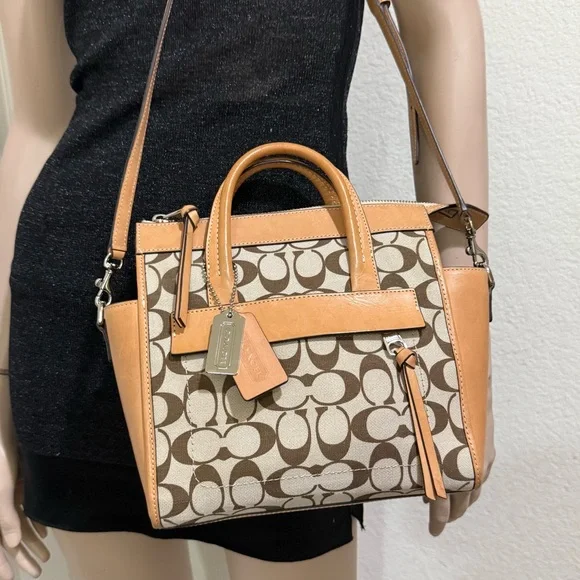 COACH 30158 Bleecker Mini Riley Carryall Vachetta Leather Signature Satchel Bag. Pre-owned with normal wear from use, overall in great condition! There are minor wear on vachetta leather as shown. Inner lining is clean with no issues. No major flaws to note. Zoom in photos for details and measurements. You will get exactly as pictured!Feel free to ask questions. All sales are final! NO returns. Thanks for looking.
