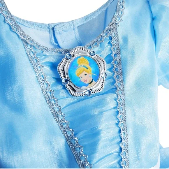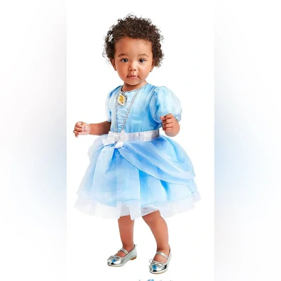 With a ''Bibbidi-Bobbidi-Boo,'' baby gets the royal treatment in this dazzling Cinderella costume. Adorned by puffed sleeves, a shimmering layered skirt, silvery stardust trims, and a jeweled cameo, she'll turn all heads at your masquerade ball.Polyester, exclusive of decorationGenuine, Original, Authentic Disney StoreBaby Cinderella gown with puffed sleeves, shimmering organza overlay, and ruffled cuffsSilvery lace trim, Cinderella cameo brooch with faceted gems, and pleated organza front panelSilvery lace trim, scoop neckline, self-stick fabric closures at back, and silver edge trimsSatin bow applique at beltline, layered organza skirts with peplum, and mesh underskirt; Inspired by Walt Disney's animated classic Cinderella